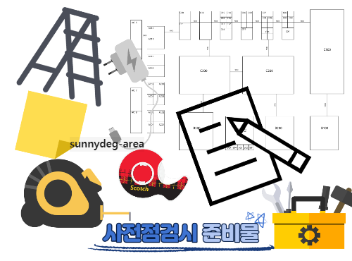 필수적인 준비물은 콘센트 위치와 치수가 표시된 도면, 줄자, 네임펜, 테이프, 형광포스트잇, 휴대폰 충전기, 접이식 의자 또는 3단 사다리 등이 있습니다. 선택적으로 수평계, 고무망치, 열화상카메라를 준비하신다면 더 자세한 점검이 되겠습니다.