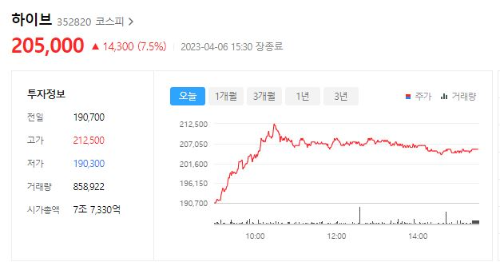 방탄소년단(BTS) 멤버인 지민의 솔로곡이 미국 빌보드 메인 싱글차트 '핫 100'에서 한국가수 최초로 1위에 오르자 주춤하던 하이브 주가가 날개를 달고 크게 상승했다. 6일 하이브 주가를 살펴보면 장중에는 10% 이상 반등을 하기도 했으며 마감은 7.5% 오른 20만 5000원으로 2개월 만에 20만 원대를 회복했다.